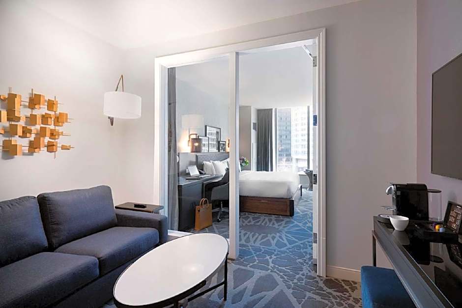 This mobility accessible suite includes city views, a 55 inch SMART flat-screen TV and living area with a sofa. It also has a refreshment center and large walk-in shower in the bathroom.